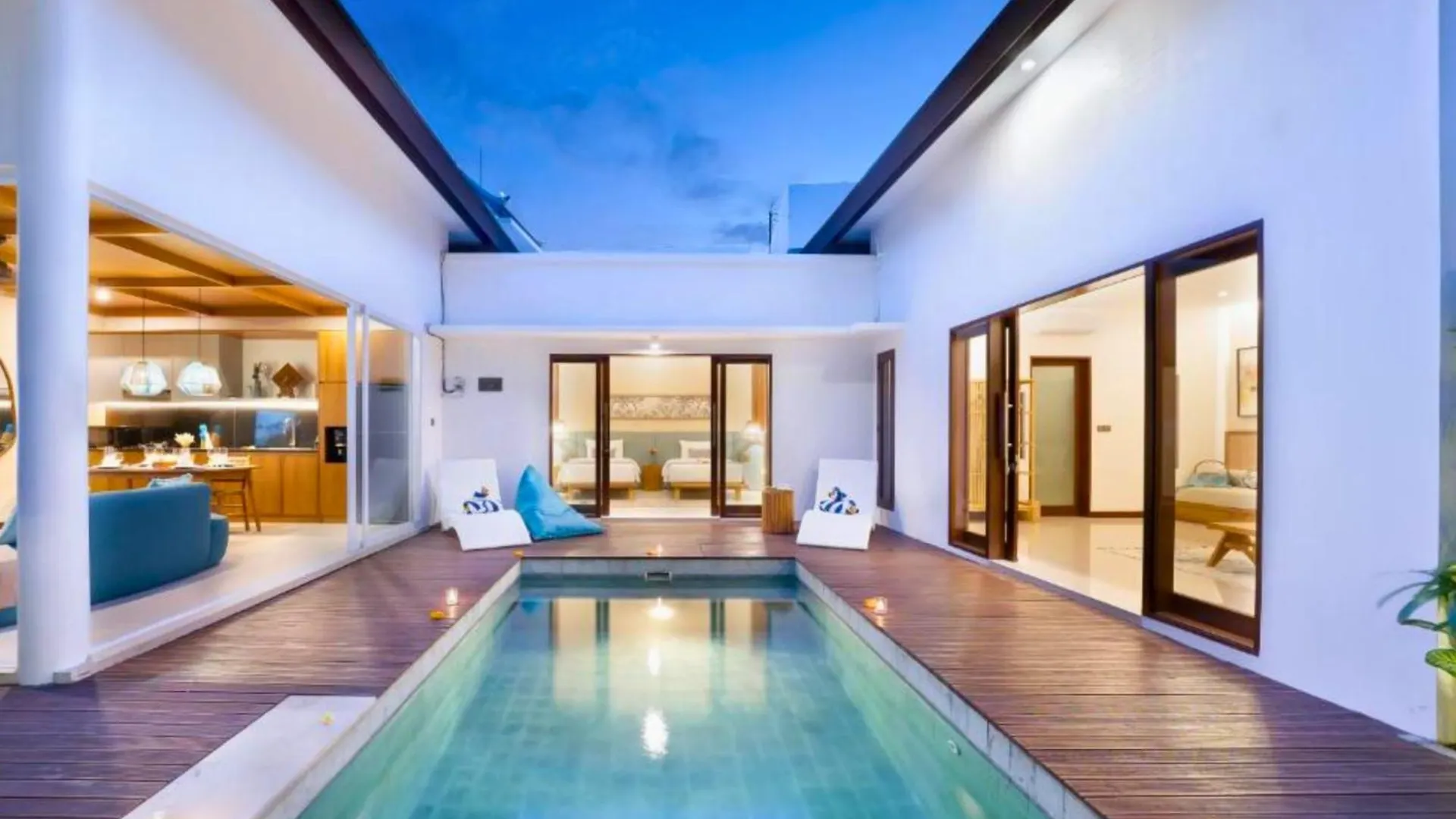 Die Villa in Canggu bietet einen Blick auf den Pool. Zur Ausstattung des Badezimmers gehören auch ein Bidet, eine getrennte Toilette und eine Dusche. Ein Haartrockner, eine Duschhaube und Handtücher sorgen für zusätzlichen Komfort.